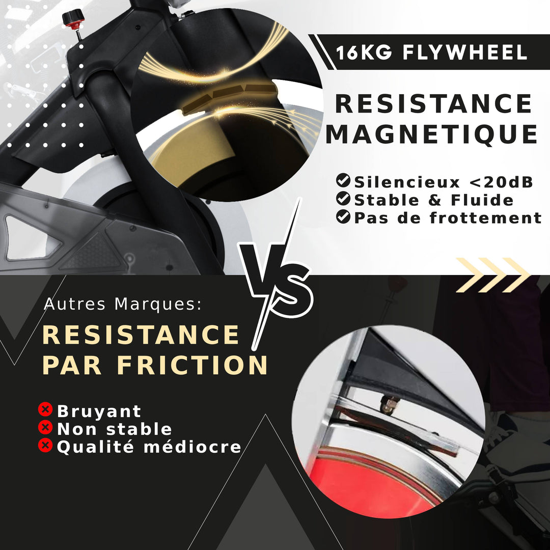 Optez pour un vélo d'appartement équipé d'une roue d'inertie de 16 kg (Flywheel) pour une excellente stabilité, associée à une résistance magnétique pour un entraînement confortable, silencieux et fluide.